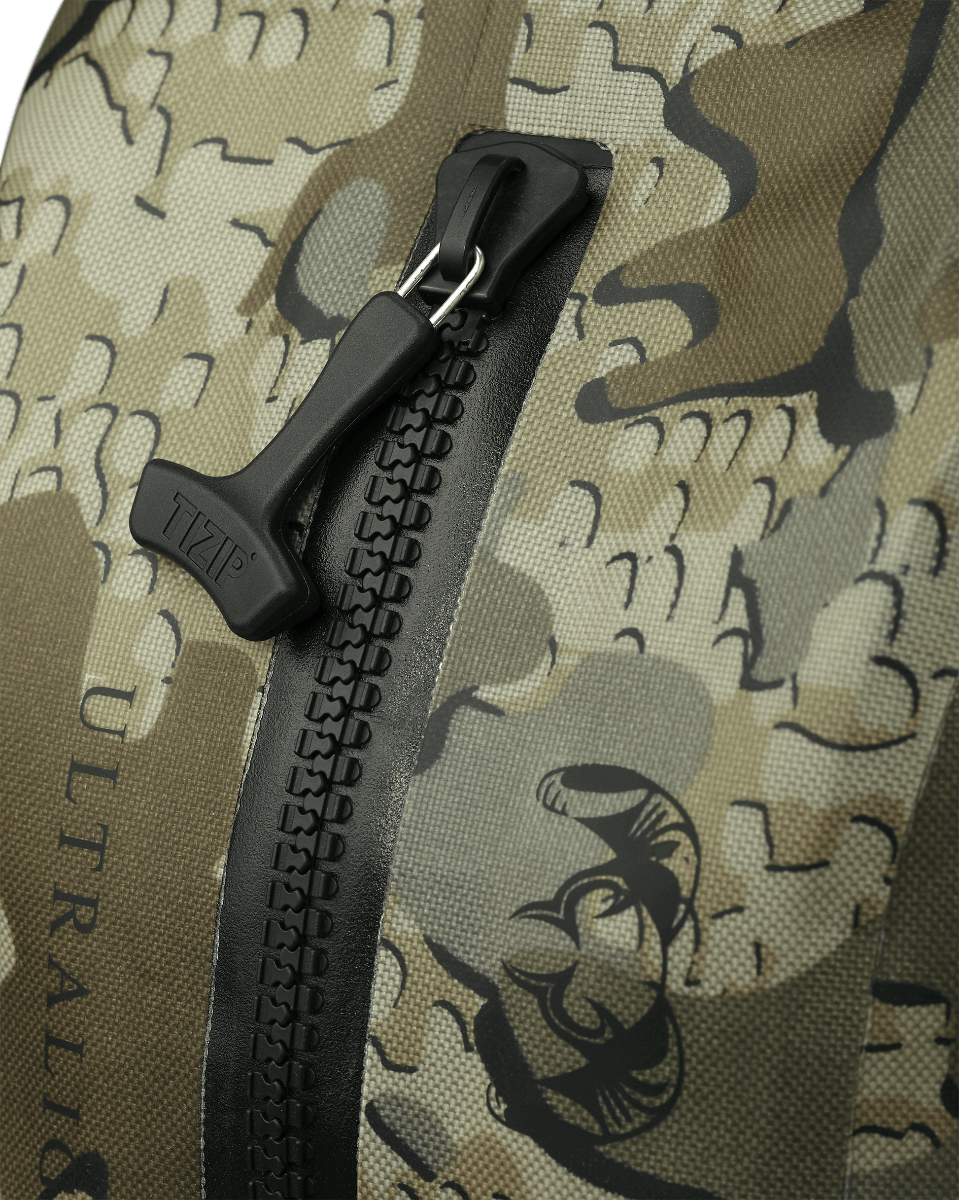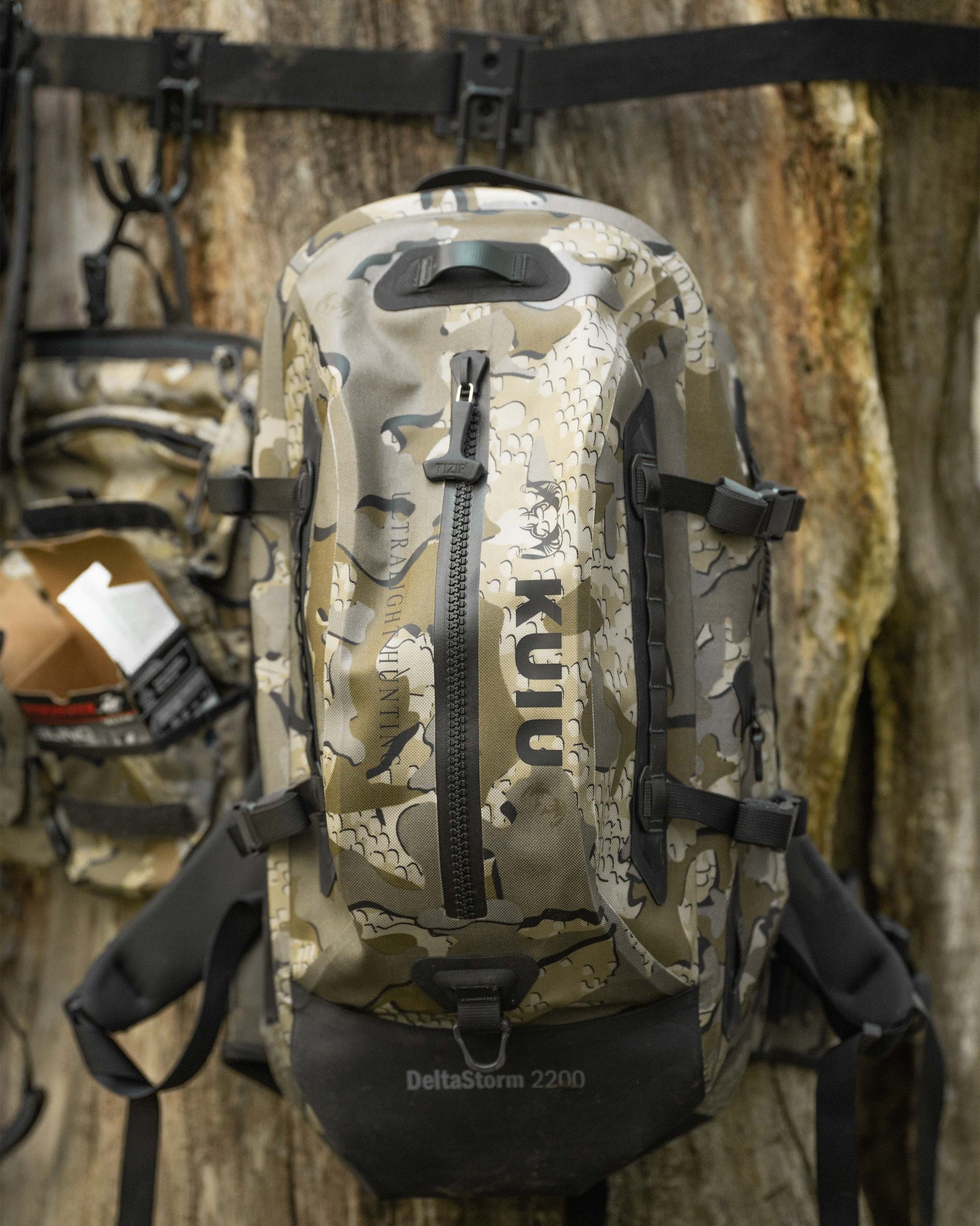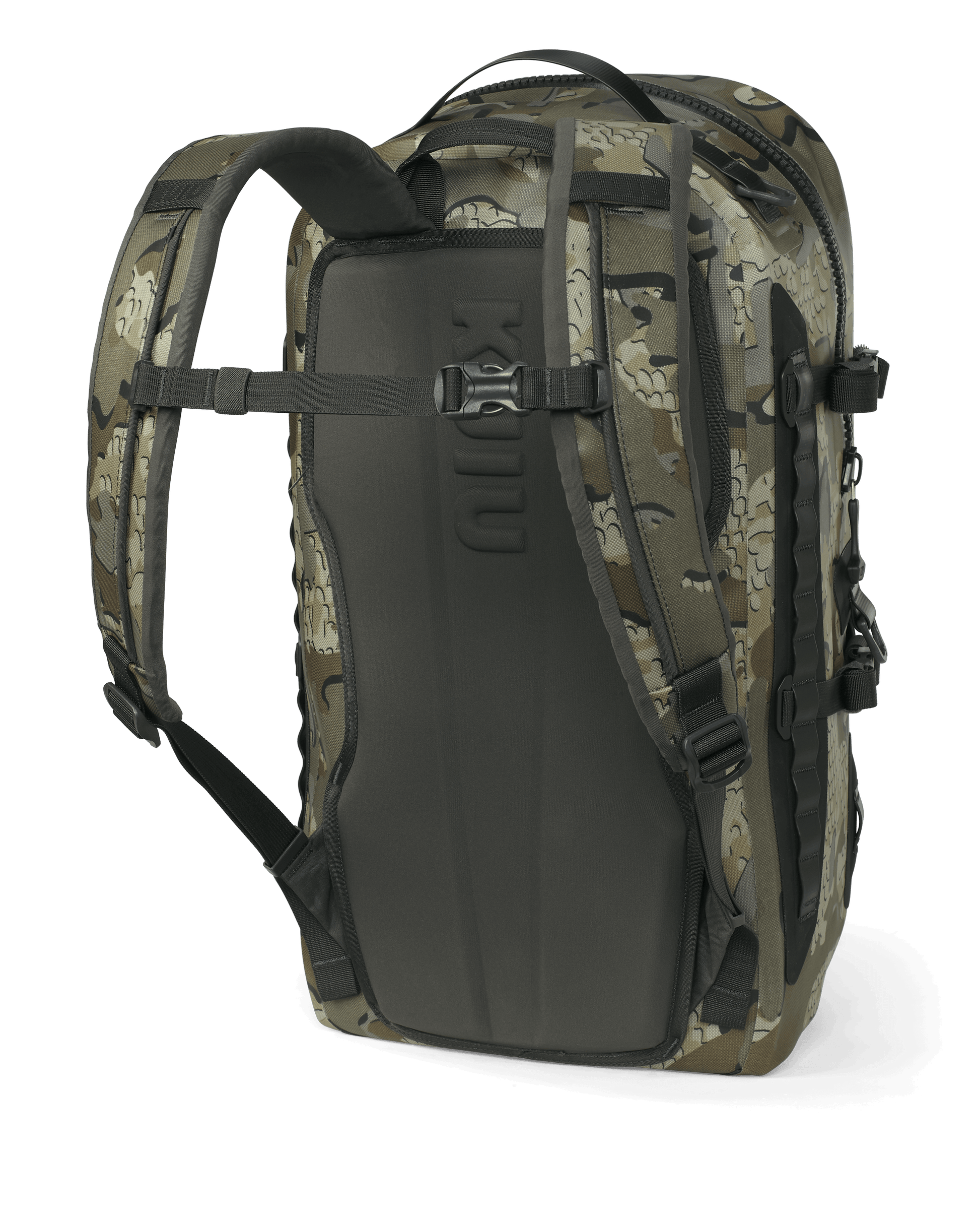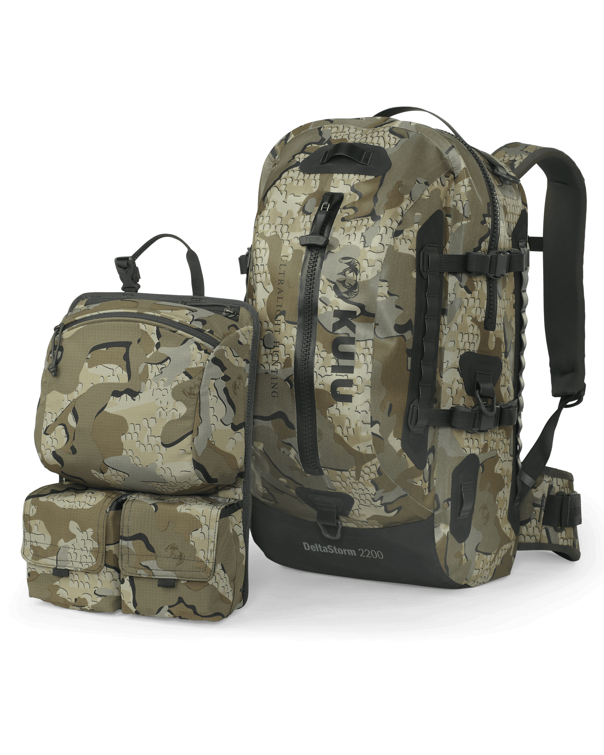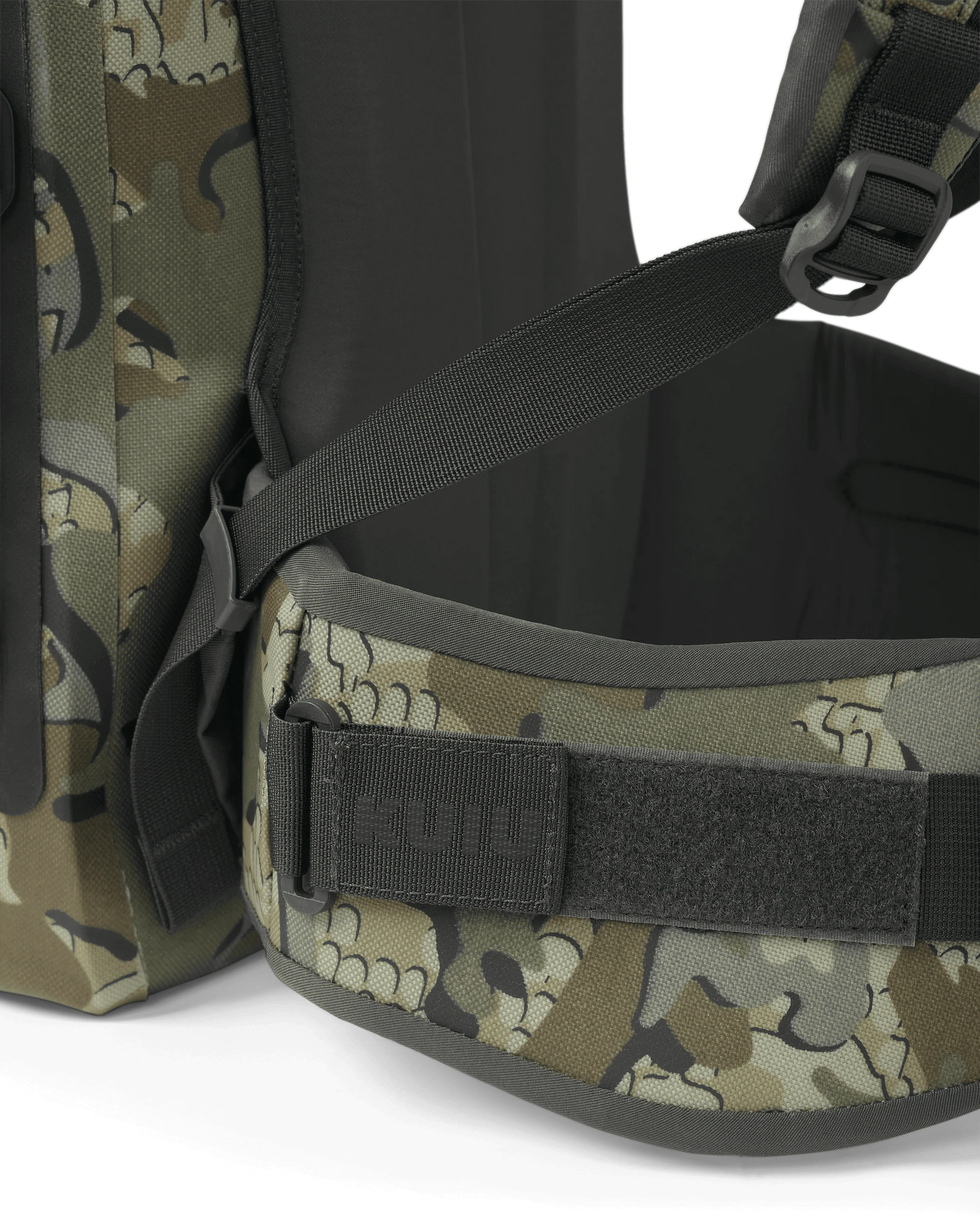 The pack features two primary compartments for gear and organization, a molded back panel for rigidity, and sit-on-the-ground shaping for the duck blind or boat. Its matte TPU coated fabric provides concealment and durability in challenging waterfowl hunting conditions. The shoulder straps and removeable waist belt leverage coated webbing for added water resistance in extreme use.