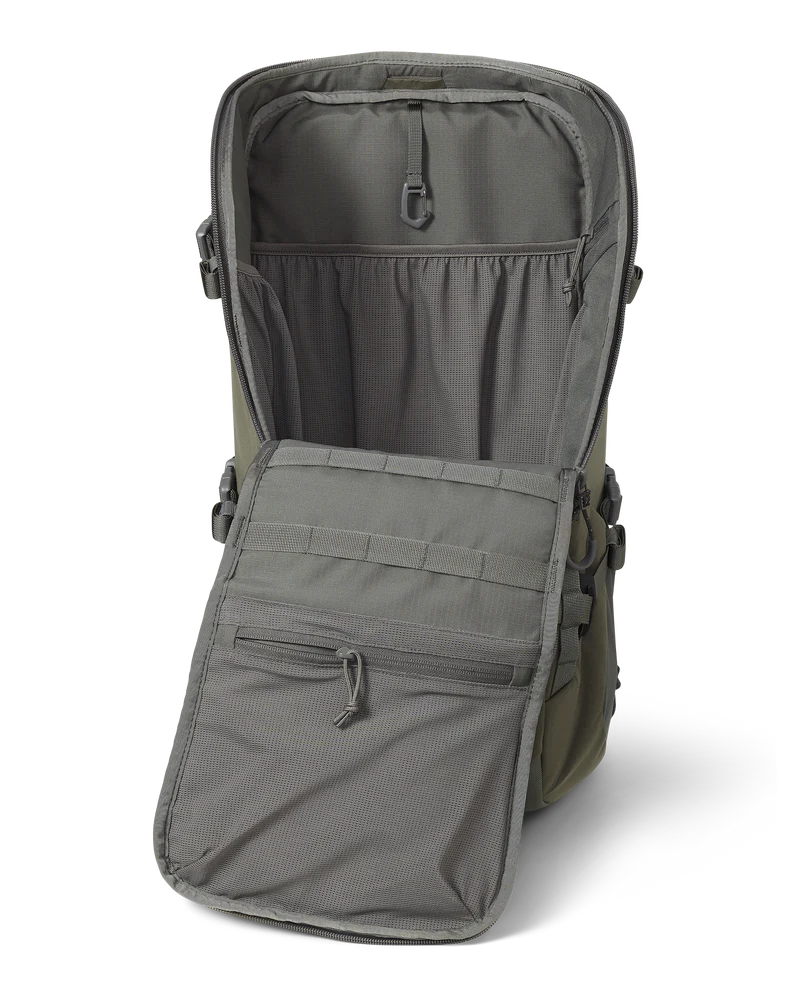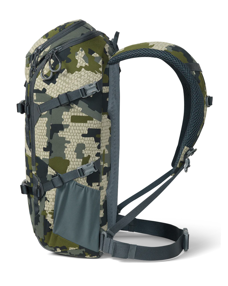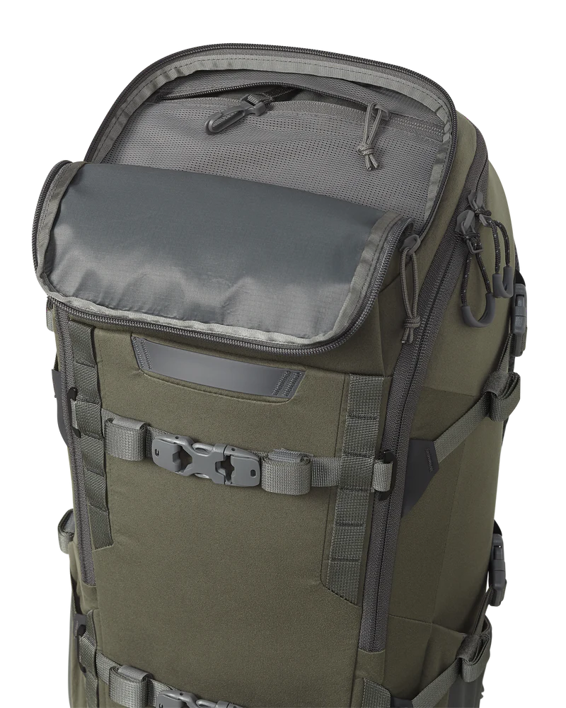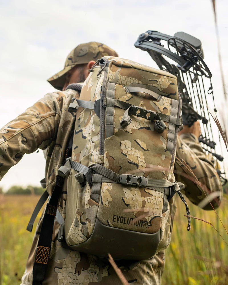 The Evolution 1800 (1800 cu. in. / 29L) daypack, crafted for whitetail hunters, blends stealth and efficiency for stand or blind hunts. It organizes essentials—clothing, calls, food, and a 3L water reservoir—with dedicated pockets for easy access, including a fold down opening with locking sliders to give quick and silent access to your calls when in the stand.