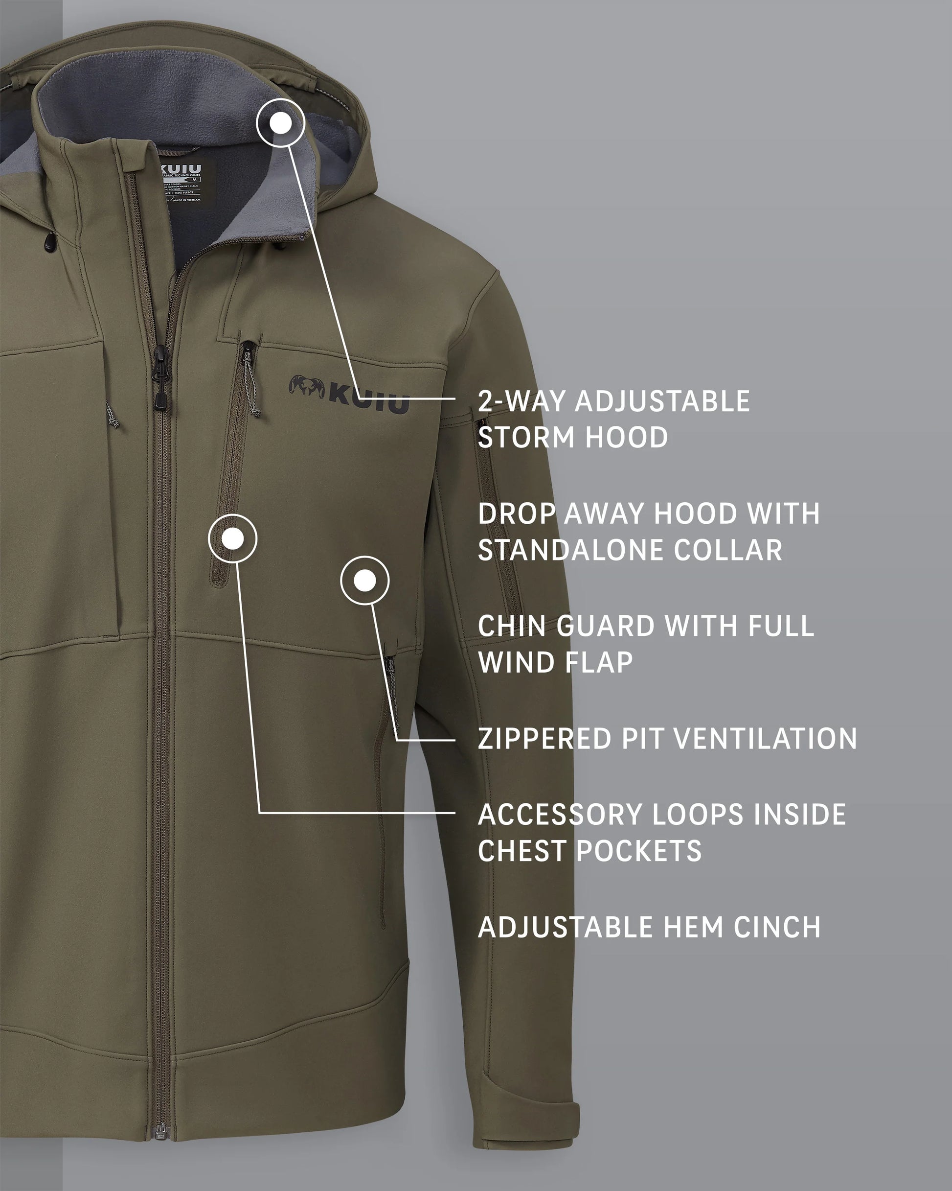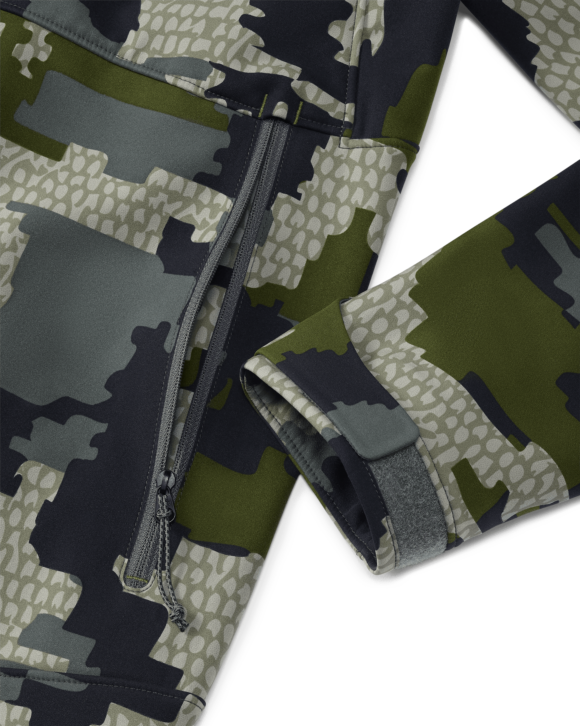 Designed for mountain hunting, the Guide PRO is ideal for colder conditions when heavily insulated layers and 100% waterproof protection are not necessary. Leveraging K-DWR® durable water repellency, combined with Primeflex® quick-drying fabric, it withstands light rain and snow in conditions most would opt for hardshell rain gear.