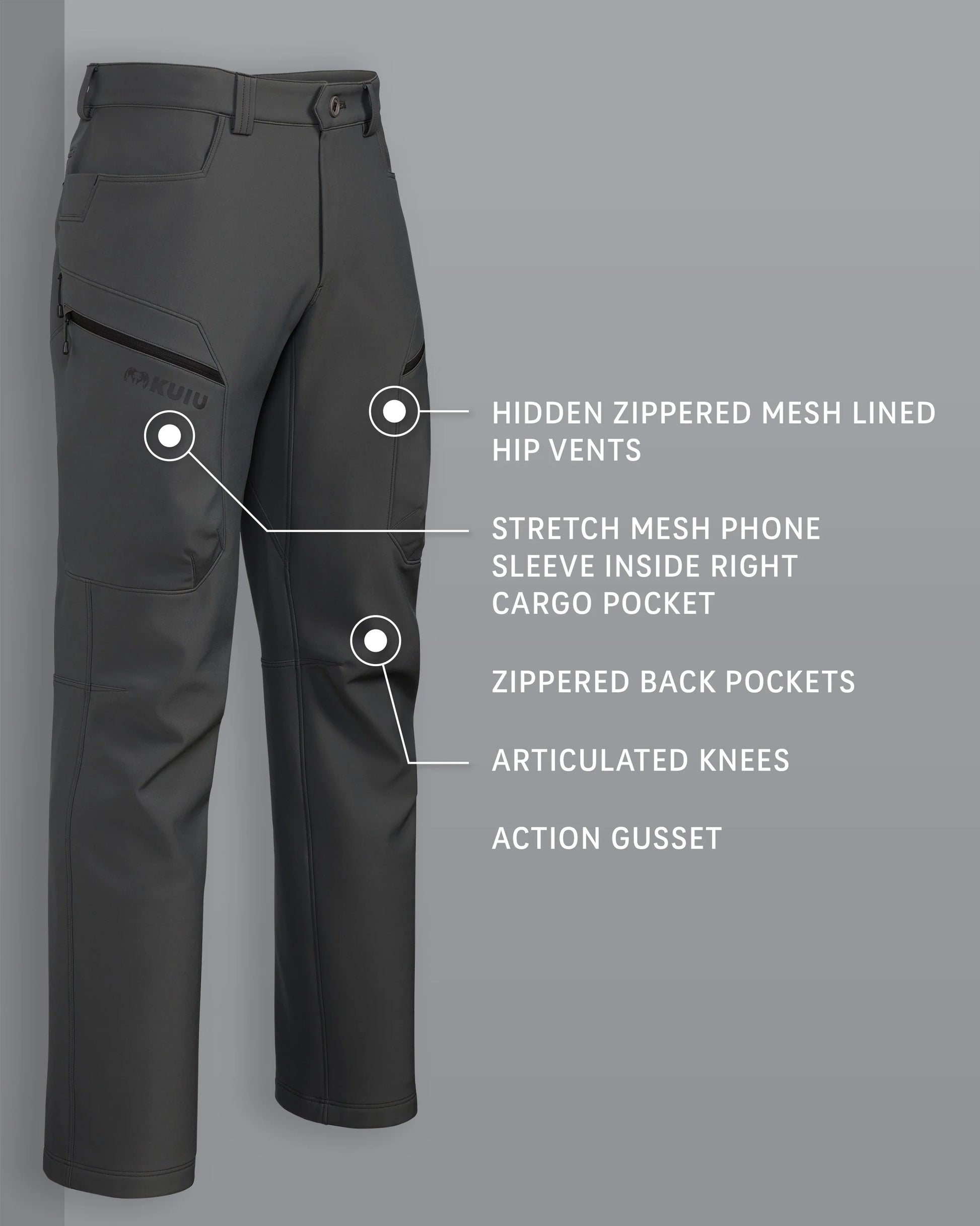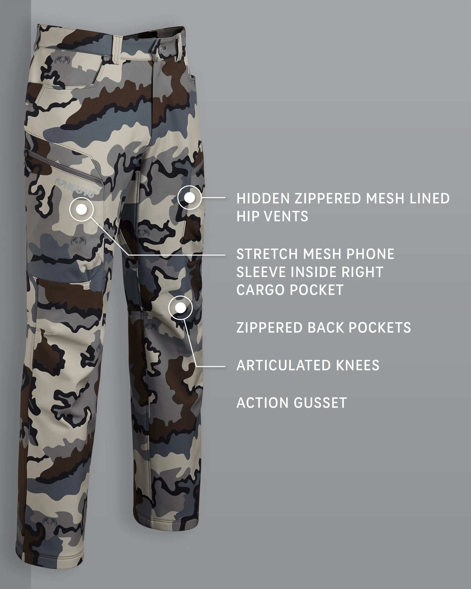 With the mountain hunter in mind, we optimized and fine-tuned every feature, including pockets designed for optimal lightweight function while maintaining warmth, a knife clip panel, hidden zippered mesh-lined hip vents for thermoregulation, and zippered cargo pockets with an internal phone sleeve. In addition, articulated knees and an action gusset complement your every move.
