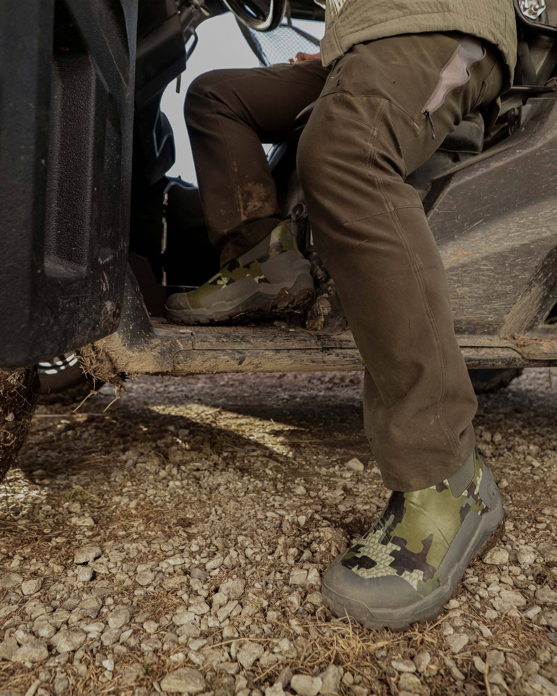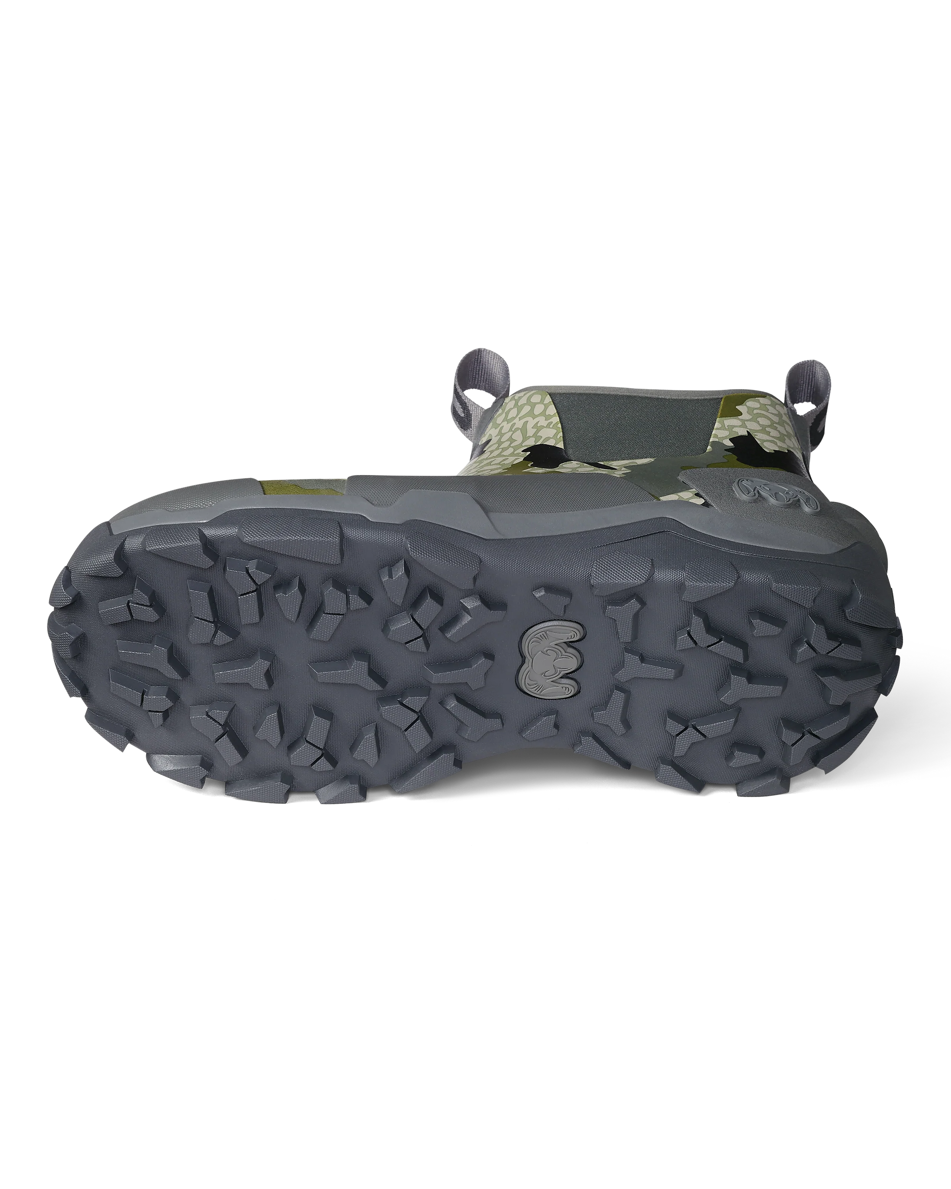 Designed for wet and muddy conditions, the patented boot tread with enhanced traction is inspired by self-cleaning mountain bike tires and features optimally shaped and spaced lugs that disengage mud. The tread design paired with an optimized ankle fit minimizes heel lift, creating a solid system for traversing through sticky clay and mud.