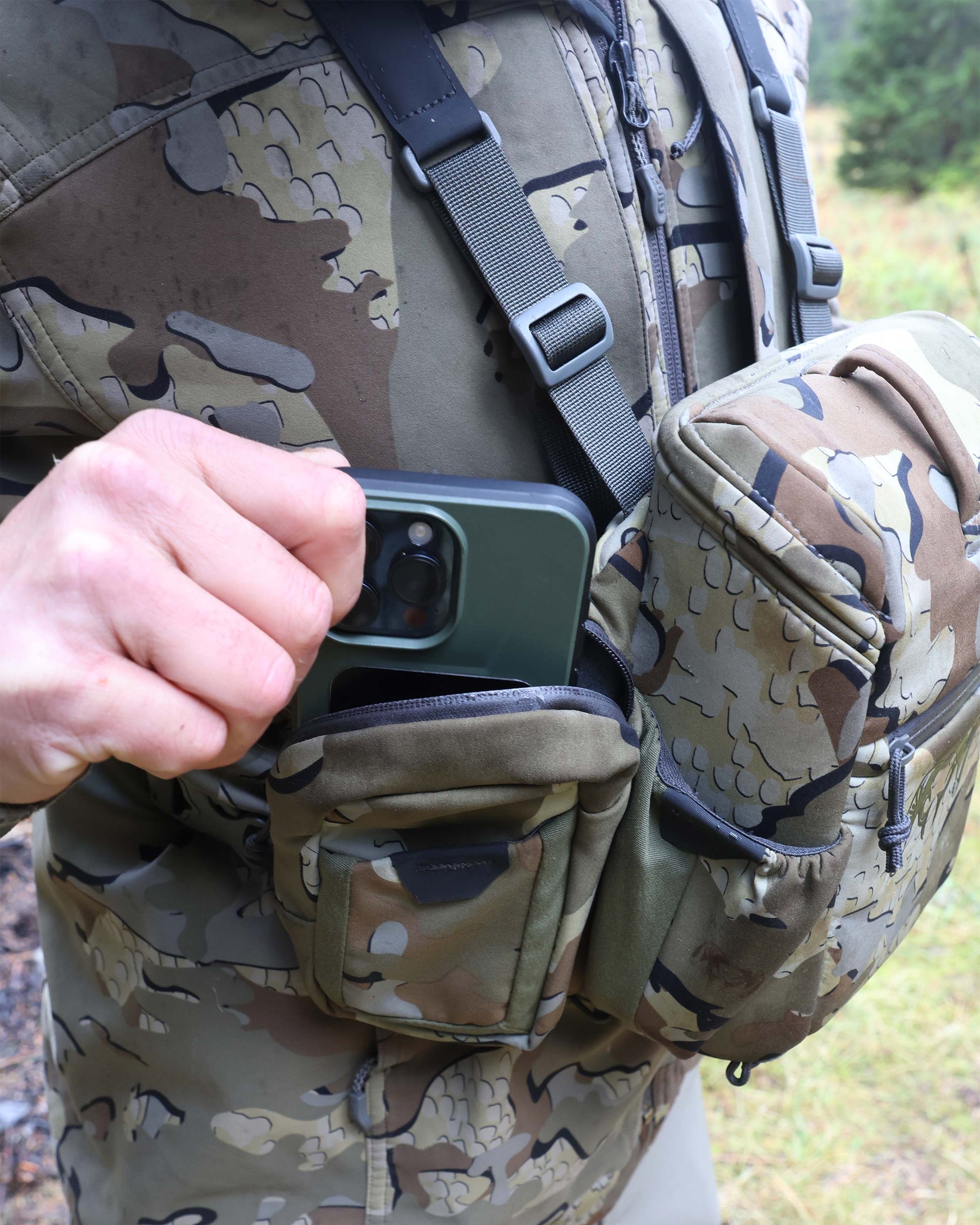 The integrated zip-closure side pockets are ideal for a rangefinder, phone, electronics, and other small essentials. The back of the main pouch features a next-to-chest drop pocket for convenient phone storage. The bottom of the pouch features an innovative Rail-Lock track connection system for the ammo holder and future accessories. Connected accessories stay securely and quietly attached while navigating dense brush or challenging terrain.