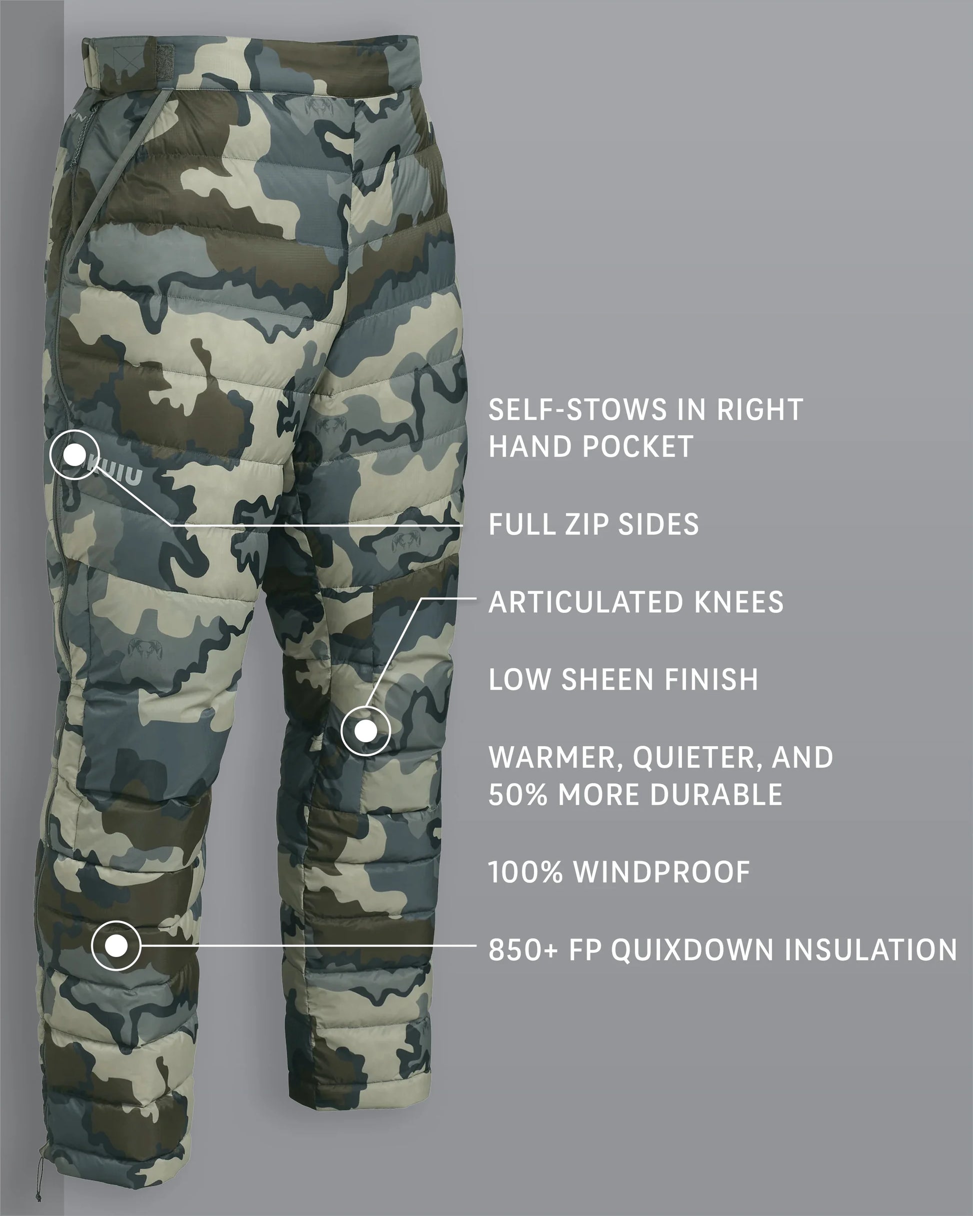 The Super Down LT Pant is sized with a versatile mid-layer fit, to comfortably layer over a base layer or hunting pant, yet trim enough to layer under our rain gear in the same size. The pant features full-length side zippers so you can put them on or take them off while standing, and without removing your boots.