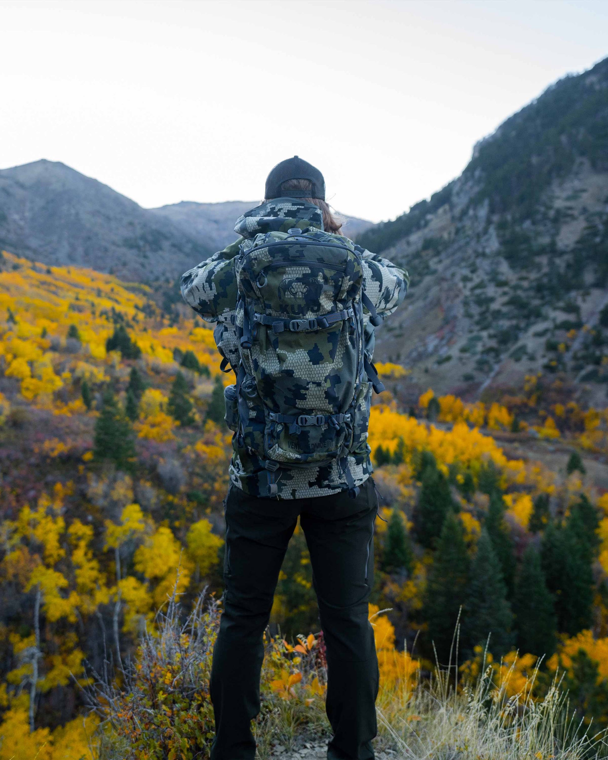 The main compartment is accessed through the side zipper or through the top shroud closure. The top shroud with dual cinch closures expands for extended capacity, keeping gear separate, or hauling taller items like a hind quarter.