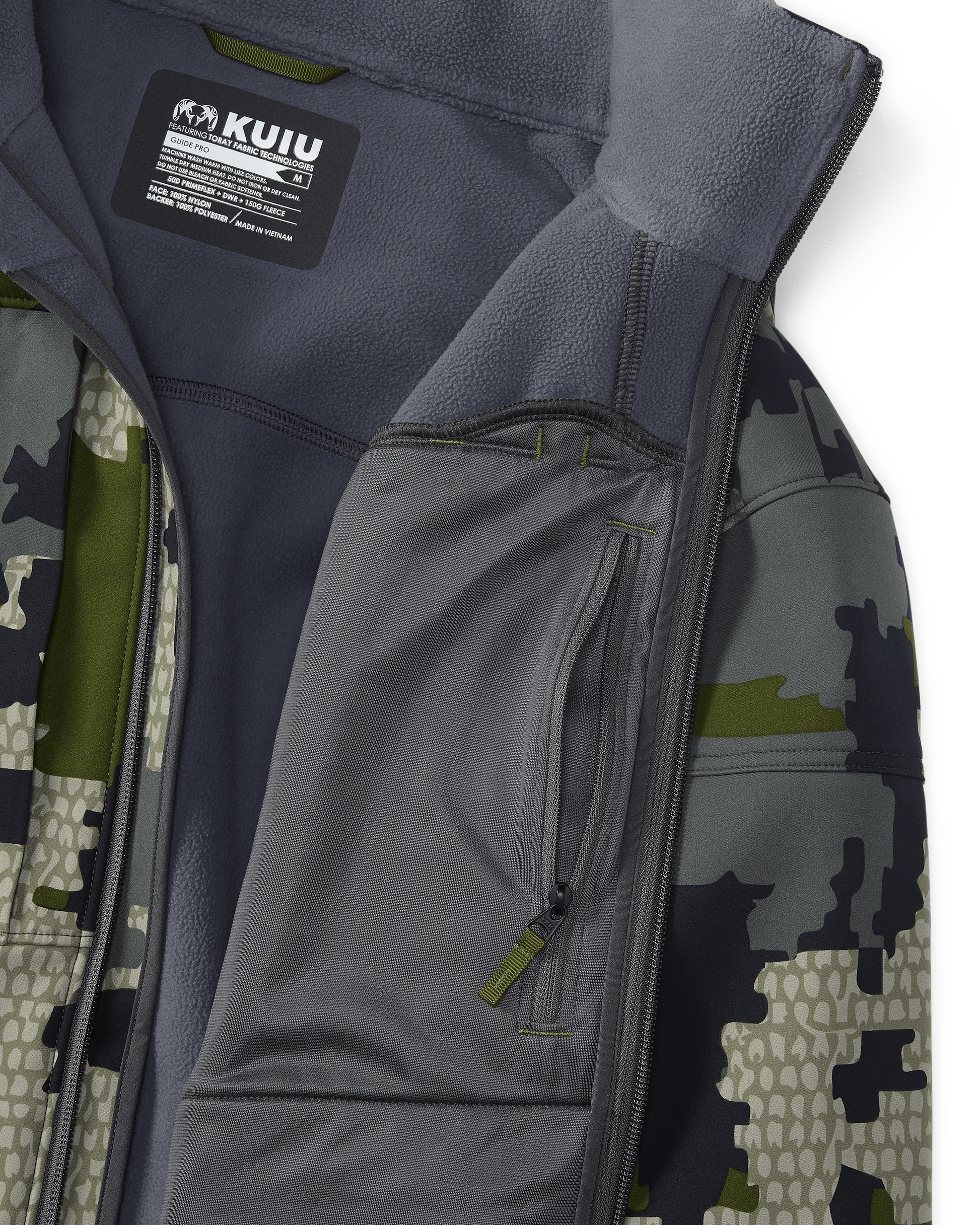 The Guide PRO is constructed with a durable nylon face fabric combined with an ultra-soft and comfortable micro-fleece interior. The layers are laminated with a proprietary wind-resistant bonding technique. While the all-new material stands exceptionally durable in brush-choked terrain, it’s remarkably quiet for archery hunting.