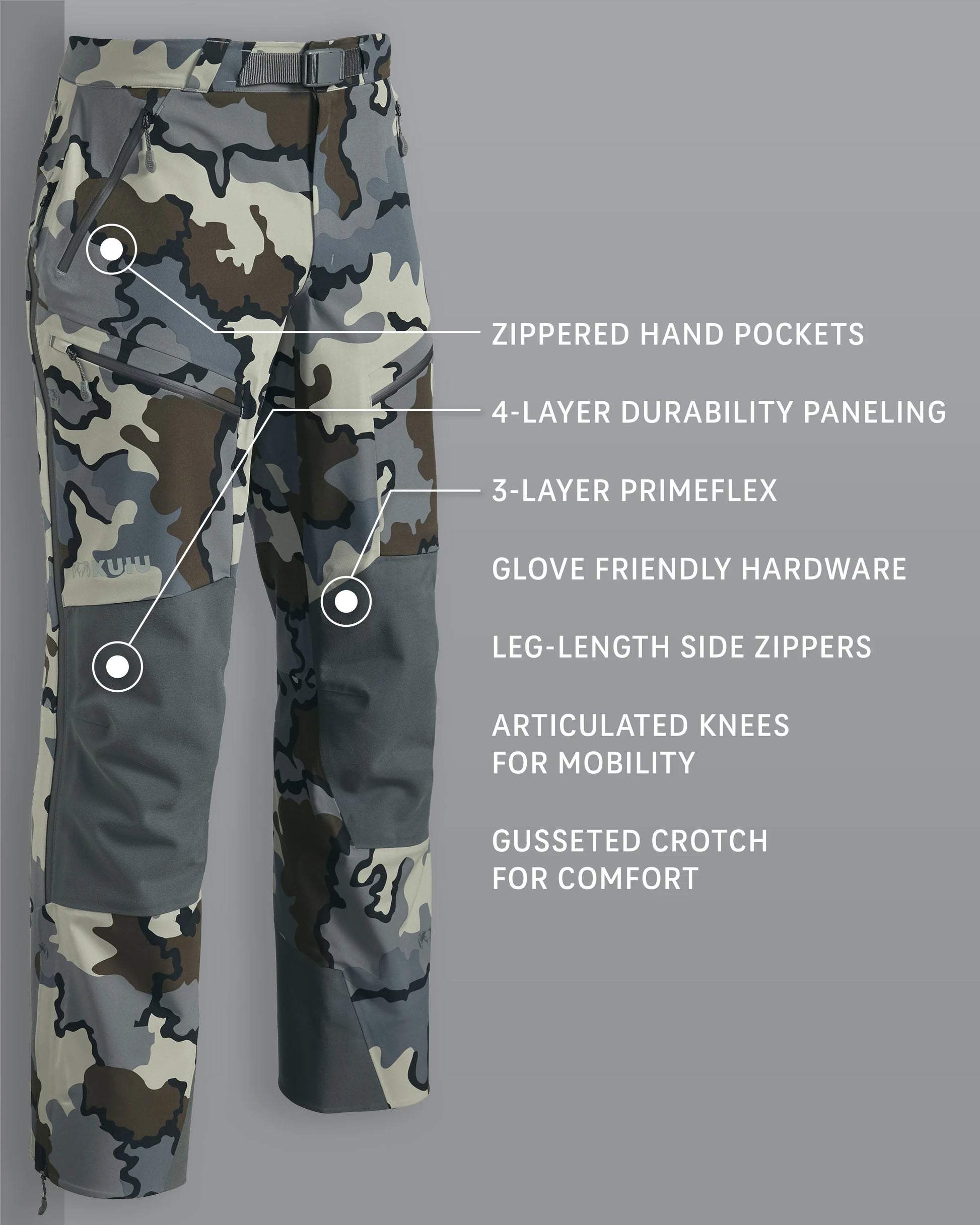 For added durability, a densely woven 4-layer fabric is leveraged across the high-contact areas—the seat, knees, and inner cuff. This allows you to go sit, kneel, or bust through brush without worrying about snagging, puncturing, or ripping your gear.